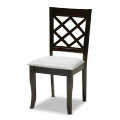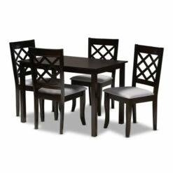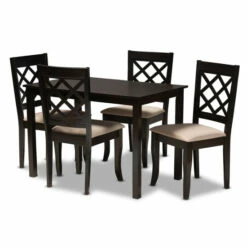 Reinvent your dining room with the sophistication of this Aden 5-piece dining set. This dining set includes one table and four chairs, each upholstered in a light polyester fabric that complements the rich espresso wood finish. Designed with both comfort and style in mind, each chair features a plush foam-padded seat, as well as an exquisite cut-out design on its back.