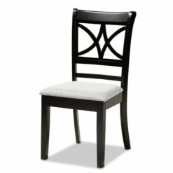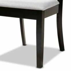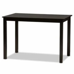 Elevate your dining space with the sophisticated design of the dining set, constructed from solid wood in an espresso brown finish and comfortably sits up to four. The requires assembly and includes one table with four foam-padded chairs, each upholstered in a soft fabric. The unique cut-out design on the back of the chairs allows the to stand out while allowing light to flow through the dining room. Providing an optimal balance of style and comfort, the dining set is a perfect fit for both formal dinner parties or casual meals.