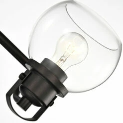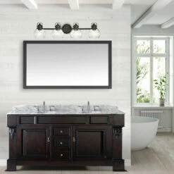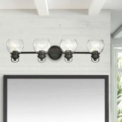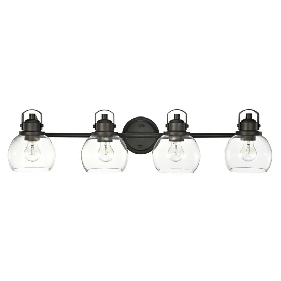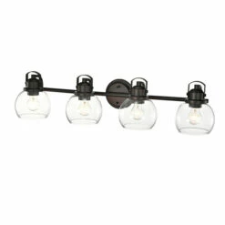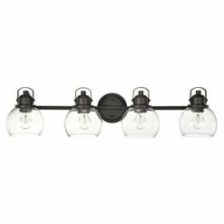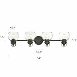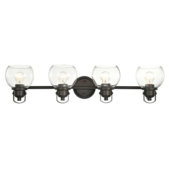 The quartet of clear bulbous glass shades adorning this gorgeous bathroom vanity light fixture provides bare illumination, for a direct yet warm and homey ambiance. This four-light piece boasts an oil-rubbed bronze finish that will complement many farmhouse, rustic, and industrially styled spaces. for a custom lighting solution you’re sure to adore.