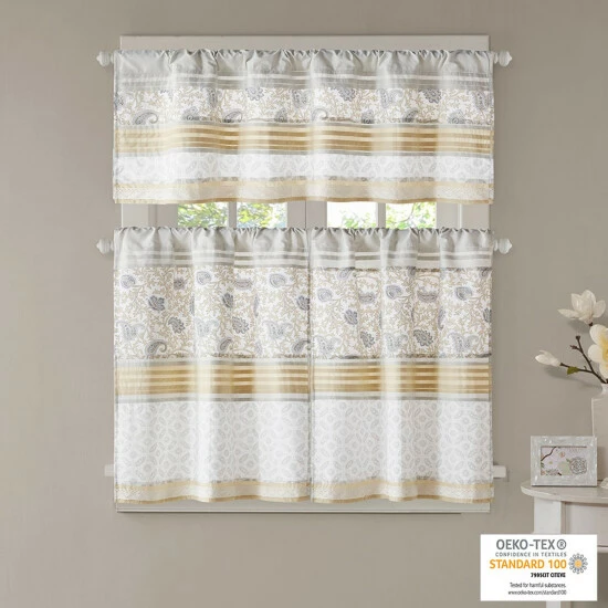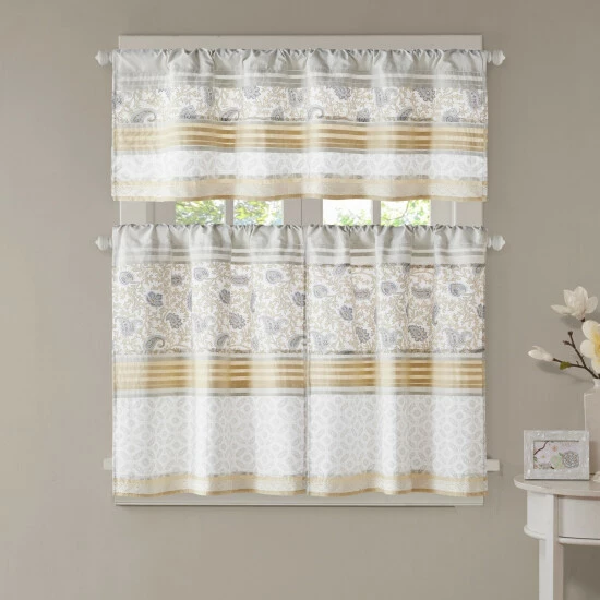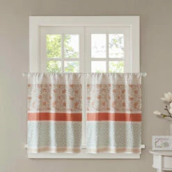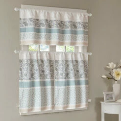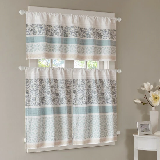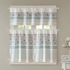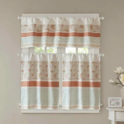 Shabby chic gets a lively showcase in this light and lovely kitchen tier set. The two valances are made of cotton for years of longevity, and the warm and lovely pattern has a brightening effect on any kitchen.