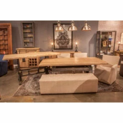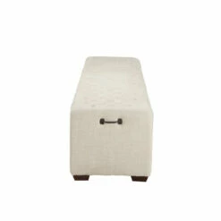 In the tradition of the classic Paris club chair comes our mid- modern , a versatile group of leather and upholstery that exude elegance and invite long conversation. Our beautiful bench from the collection features a solid wood frame wrapped in beige linen fabric with diamond-shaped tufted detailing. This minimalist bench is sure to be a beautiful addition to any home or setting, with it’s neutral colors and clean lines. Fully upholstered, the 58-inch long bench combines a luxurious tufted seat with dark walnut legs and distressed bronze side handles for a rich focal point in your foyer or living room.