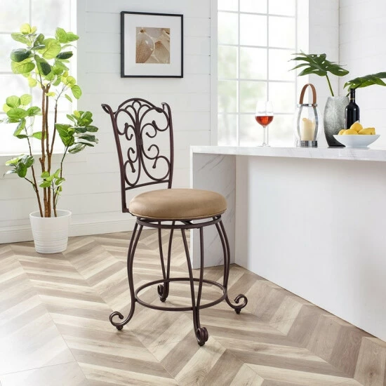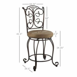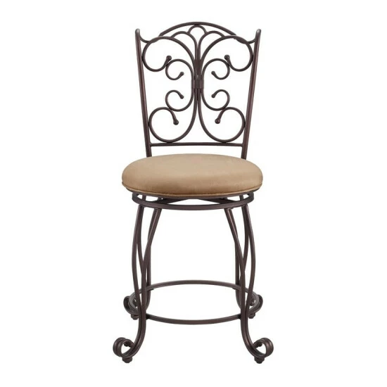 The elegance and unique style of this 24″ Gathered Back Counter Stool will carry throughout your kitchen, dining, or home pub area. Crafted of metal and highlighted with subtle curves and a distinctive back, this stool is a positively striking addition to your home. The cushion is piled high for extra comfort and covered in a light brown/caramel microfiber. This stool is elegant and versatile making it the perfect choice for any gathering area. 275-pound weight limit.