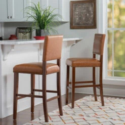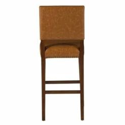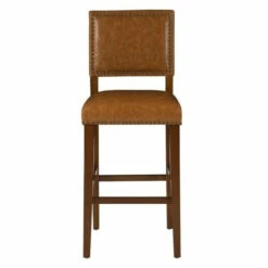 Create a contemporary or classical look in your kitchen, dining or home pub area with this sleek faux leather bar stool. With its solid wood legs, this courtly stool guarantees strength to ensure years of everyday use. The padded cushion and back provide optimum comfort for you and your guests. The stool is finished with a durable Caramel faux leather PVC that is both stain resistant & fade resistant and features decorative tightly woven threads and classic nail head trims.