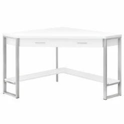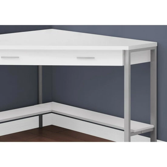 That unused corner in your home just got filled with this perfectly angled, contemporary style, corner computer desk. The silver metal framing elevates the whole design into a stylish and practical workspace. This desk provides plenty of storage options, with a single long drawer accented with sleek silver plastic handles, and open bottom shelving for books and other office essentials within easy reach. Finished in a chic white on all sides also allows you to bring it to the center of the room for all to admire.This unique style corner desk has everything you need to create your personal home office setup.