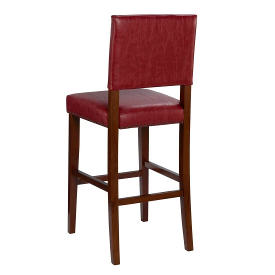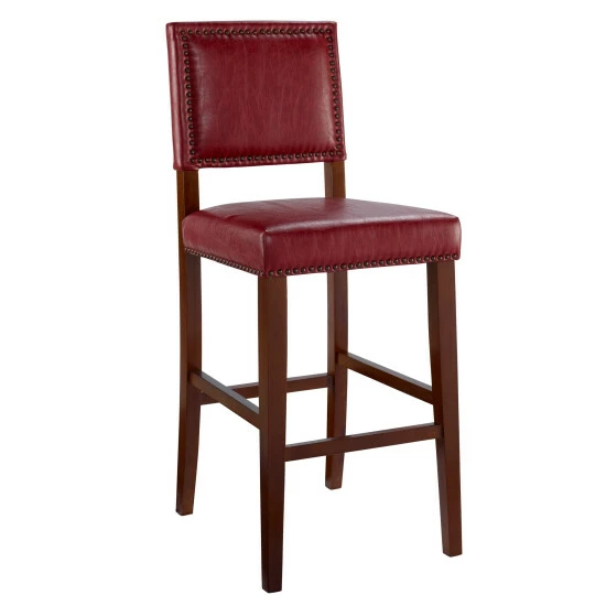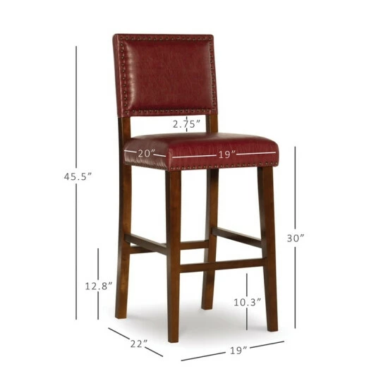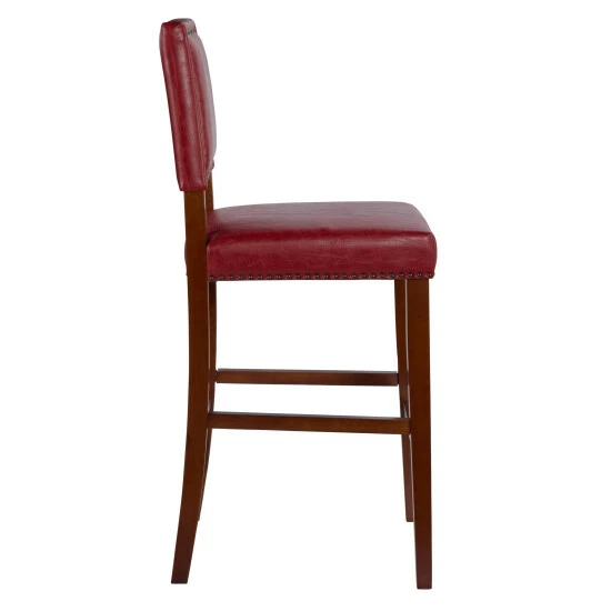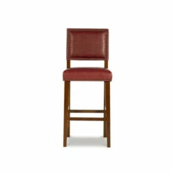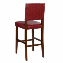 Create a contemporary or classical look in your kitchen, dining, or home pub area with the sleek shape and style of this medium walnut finish 30″ bar stool. Solid wood legs give this courtly stool additional strength ensuring years of everyday use. The padded cushion will provide optimum comfort for you and your guests and is topped with durable rich red vinyl that is stain resistant, fade-resistant, and features tightly woven threads that won’t break, mat, or peel.