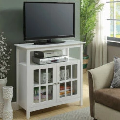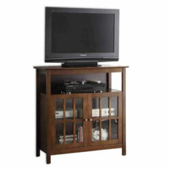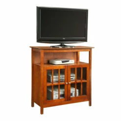 This charming two-door TV stand single-handedly refreshes your home decor. Its modern yet traditional style offers simple, clean lines, and beautifully contrasting finish, as a solid pine construction, finished with a rich birch veneer, houses tempered clear glass windows.