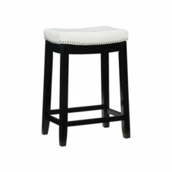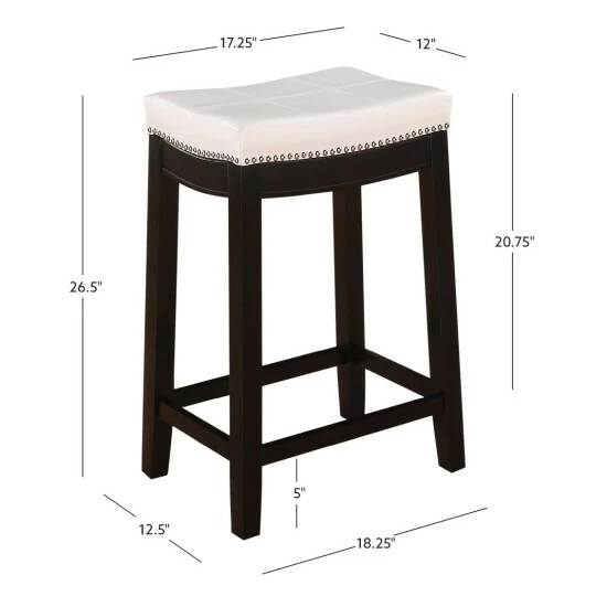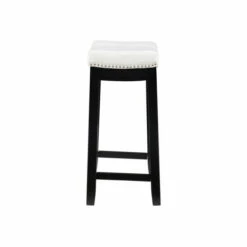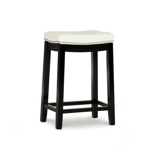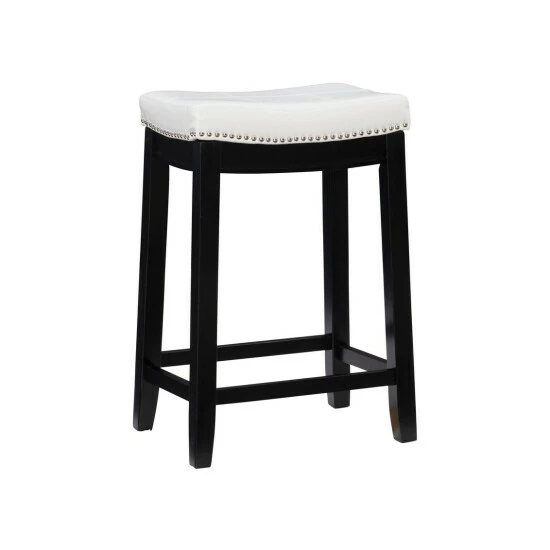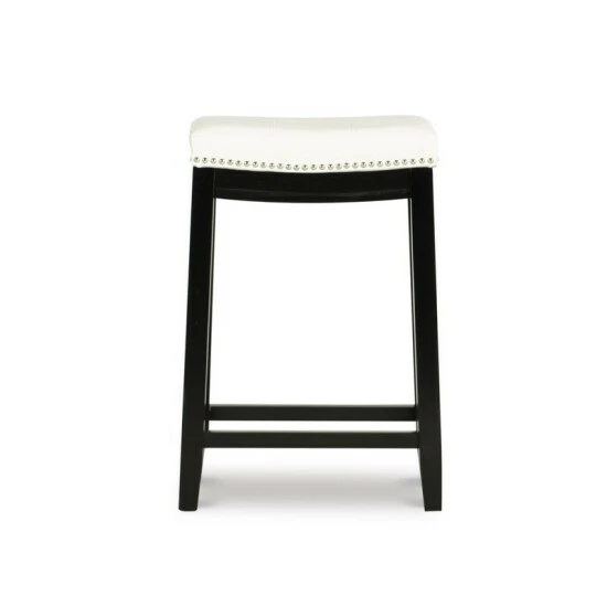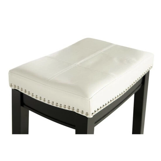 This White Counter Stool will add stylish seating to any counter or high-top table in your home. The sturdy wood frame has a black finish accented by a white faux leather upholstered seat. Silver nailhead trim and double-needle stitching add durability to the padded top for an eye-catching detail.Β