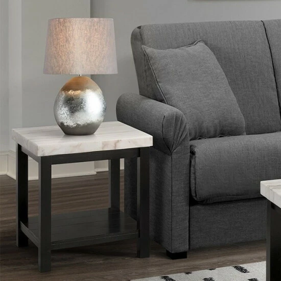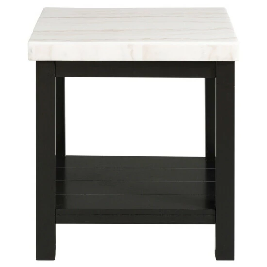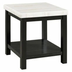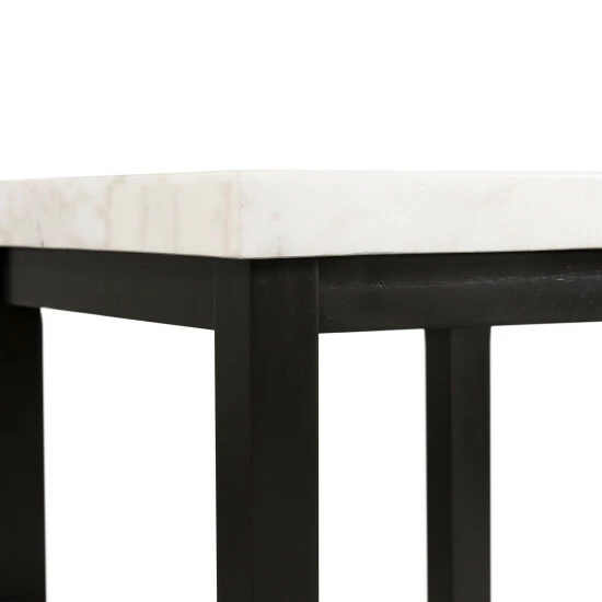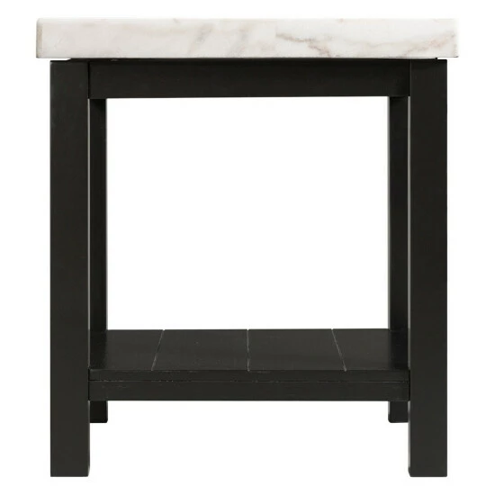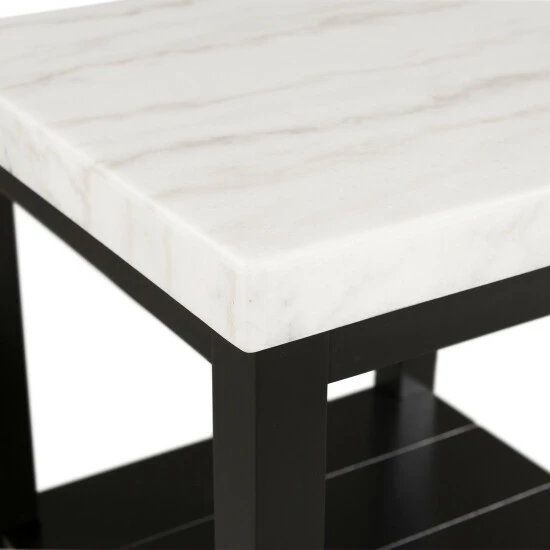 This enticing accent table boasts a solid, square, white marble top that contrasts beautifully with its black wooden base. This piece includes a bottom shelf, ideal for displaying your favorite things, while its clean-lined, right-angled silhouette strikes an eye-catching figure.