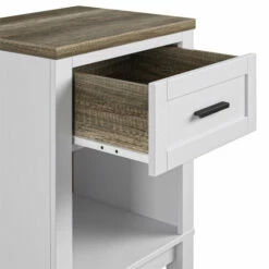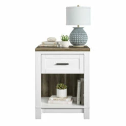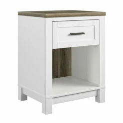 The ideal bedside accessory, this nightstand has a drawer for concealed storage of small items, along with an open shelf on the bottom for books and more. Made of laminated particleboard for a sturdy build that will last, this piece provides intricate details like a framed drawer with a soft inner lining.