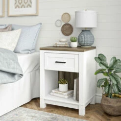 The ideal bedside accessory, this nightstand has a drawer for concealed storage of small items, along with an open shelf on the bottom for books and more. Made of laminated particleboard for a sturdy build that will last, this piece provides intricate details like a framed drawer with a soft inner lining.