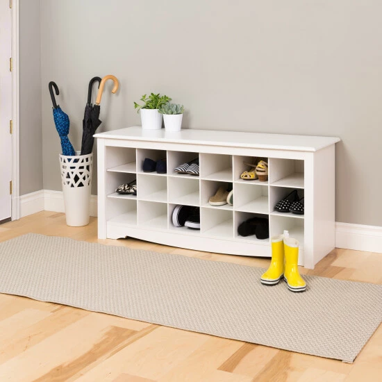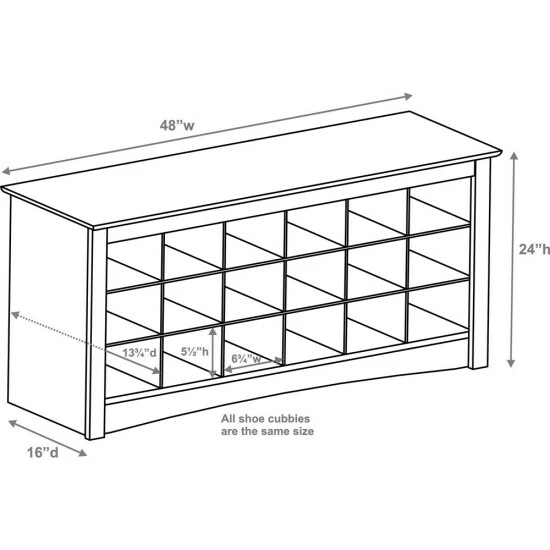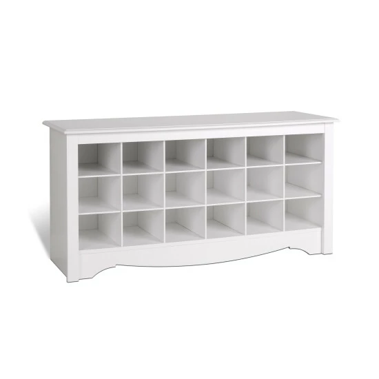This storage cubby bench offers you a perfect place to sit while putting on or removing your shoes as well as a convenient place to store them. A great addition to your foyer, mudroom, utility room, or bedroom, the bench has 18 individual cubbies that are spacious enough to hold a pair of size 13 men’s shoes.