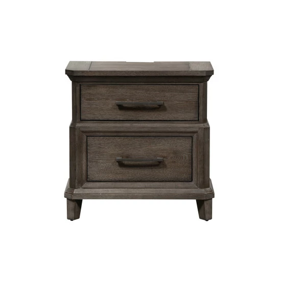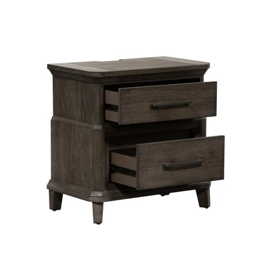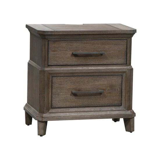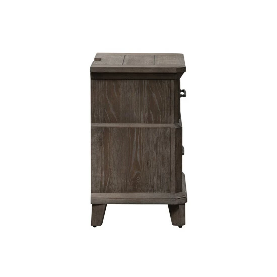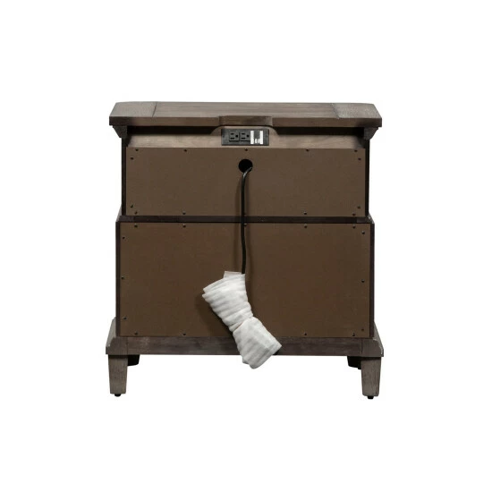 Make a statement with the simplicity of this Artisan Prairie 2 drawer night stand. Crafted by rubberwood solids and split hear white out cathedral veneers, this piece features a felt lined top drawer, cedar lined bottom drawer and a timeless wire brushed aged oak with gray dusty wax finish. With today’s electronics in mind, this piece includes a 2-port charging station for user convenience, making multi device charging a breeze.
