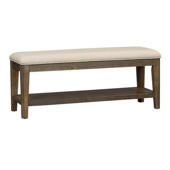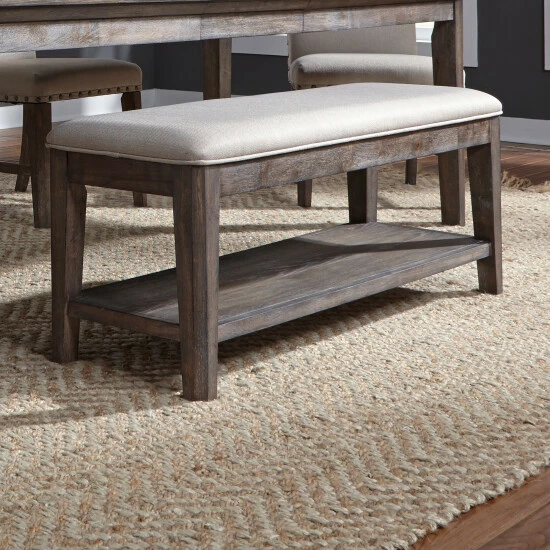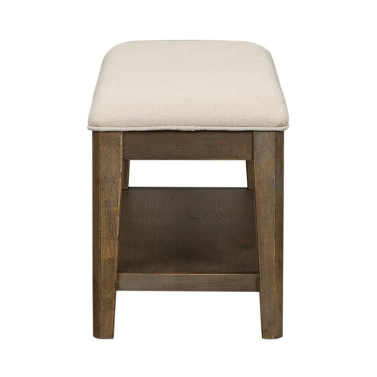 Sit in comfort and style with the Artisan Prairie upholstered bench. Crafted of rubberwood and poplar solids, this piece features a wire brushed aged oak finish with gray dusty wax, nylon chair glides to protect your flooring, cream chenille upholstery, and a bottom shelf for additional storage. Artisan Prairie offers a natural feeling created by the living space as well as the furnishings that attribute to it.