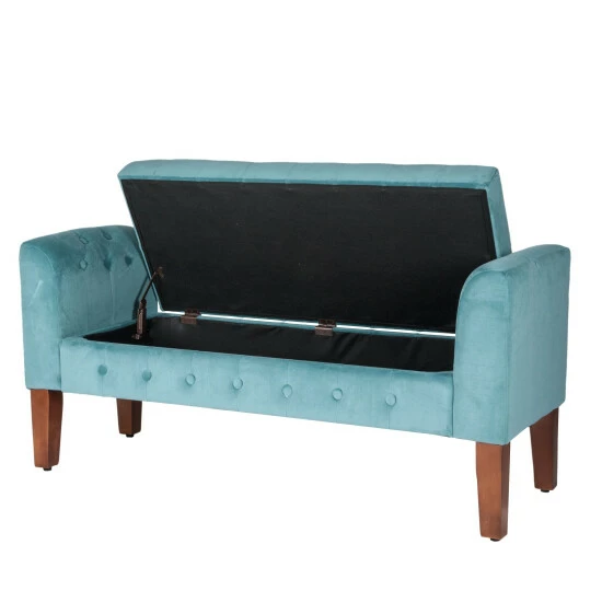 This elegant storage settee features all over button tufting for a luxurious look and feel. Upholstered in a soft and durable premium velvet fabric, this decorative bench has wood legs in a range of rich finishes. The hinged seat opens to reveal storage suitable for spare throws or pillows, books, magazines or toys. Use it as an end of bed bench, as an entryway bench or as extra seating and storage in a living room. This velvet bench is available in 7 rich colors and is part of a broader collection including accent chairs, tufted storage ottomans to match in the same great velvet fabric. Easy to assemble and maintain.