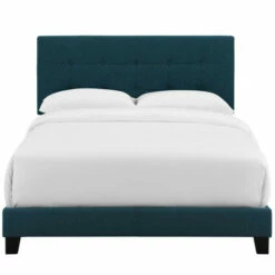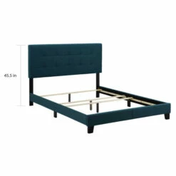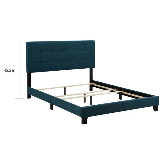Flaunting a distinctive, contemporary style, this Twin-sized platform bed comes with a soft polyester fabric upholstered base, timeless button-tufted headboard, and wood bed frame and legs, not to mention non-marking foot caps. Complete with a reinforced center beam for maximum stability, this bed accommodates memory foam, spring, latex, and hybrid mattresses.Β
