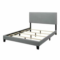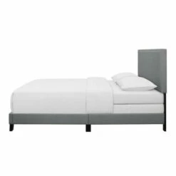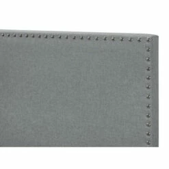 Modernize your bedroom with the Aubagne panel bed from Copper Grove. The wood frame is upholstered with grey polyester and detailed with silver nailhead trim. Choose from four sizes to fit your space and mattress.