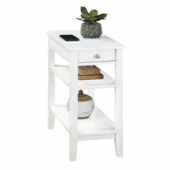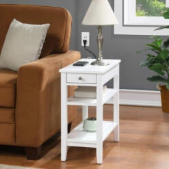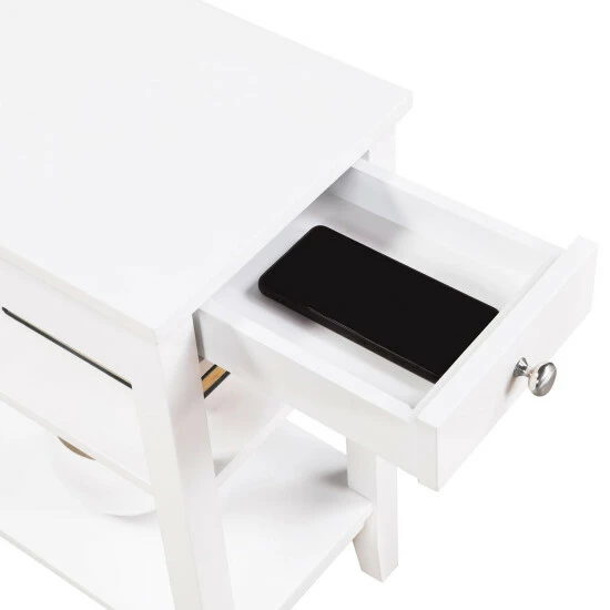 Add functionality and style to your home with the Copper Grove Aubrieta 1 Drawer Chairside End Table with Charging Station. Available in multiple finishes, this versatile and transitional style chairside table is sure to upgrade any living space. Conveniently and discreetly located on the backend of the table is a charging station featuring two USB ports and one plug outlet perfect for charging a cell phone, tablet, and more. The power supply cord is 6 feet in length giving this end table the flexibility needed when it comes to placement. The classic design of this beautiful end table also includes three spacious tiers of shelving for decor or collectibles. A smooth nickel drawer knob on the pull-out drawer allows for easy access to family room essentials. Built from solid wood and finished with a smooth veneer, this unit is sure to last.