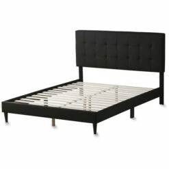 - Elegantly modern upholstered platform bed frame with slats and a matching upholstered headboard