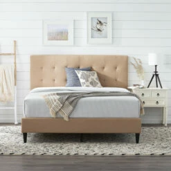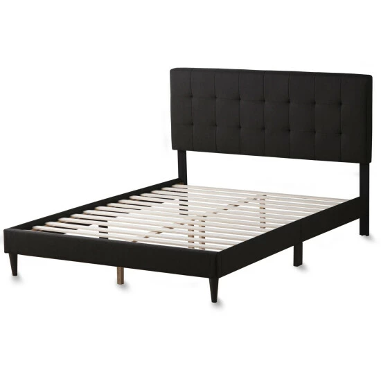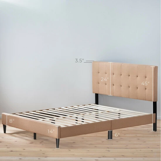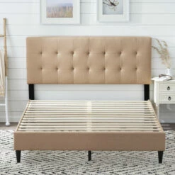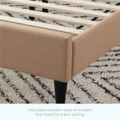 A gorgeous upholstered finish, a sleek design, and easy assembly; what more could you want? The Upholstered Platform Bed Frame is the perfect statement piece to finish any bedroom. Upholstered side rails create an elegant look that matches perfectly with a classic buttonless square tufted upholstered headboard. Included slats easily unroll and fit into the bed frame to create even, lasting support that eliminates the need for a box spring. Durable and classy legs finish the design for a versatile look that will go well with most styles and preferences. Everything you need, except a screwdriver, to quickly and easily assemble this bed frame is included in a compartment on the back of the headboard. Ships quickly and easily in one box, right to your front door. Choose one of our neutral colors and finish your bedroom in style.