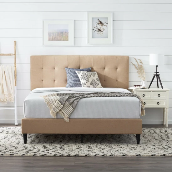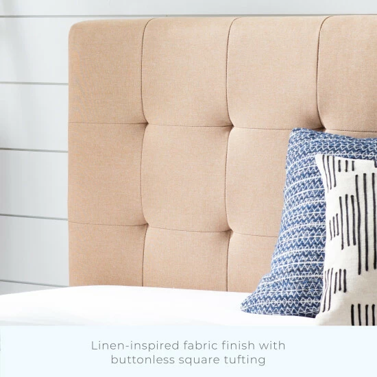 - Headboard has a linen-inspired fabric finish with buttonless square tufting for a classy look