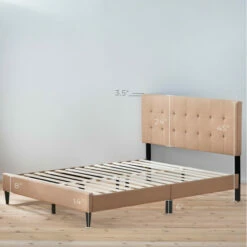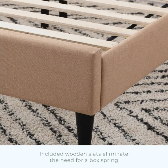 - Bed frame has thick side rails and wooden slats that eliminate the need for a box spring