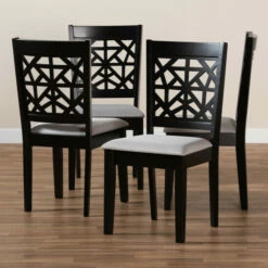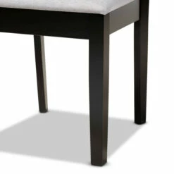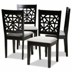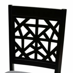 Intricate design unites with modern comfort in the dining chair. the is constructed from strong wood in a classic square frame. The back of the chair features a unique cut-out design with sleek angles for a contemporary look. The requires assembly and is fitted with a foam-padded seat upholstered in soft fabric. A striking espresso brown finish on the wood brilliantly complements the lighter tone of the fabric, allowing the chair to stand out and play a central role in the dining room.