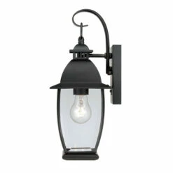 This transitional lighting fixture complements many architectural styles and gives the exterior of your home both beauty and security. This outside brass shade fixture with mystic black finish has a classic silhouette featuring clear beveled glass for optimum light output.
