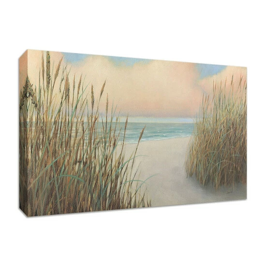 This piece will bring you right on the beach. The ocean sits on the horizon with the sun starting to set. Tall grass forms a path inviting you to jump in. This painting is guaranteed to bring peace to any room. Use coastal and beach paintings and photographs in areas of repose to give your home a peaceful feeling. We start with a thick 290 GSM 100% cotton canvas. The canvas is printed on a Giclee printer using twelve colors to produce a rich, deep color tone that truly is better than normal printed canvas. Next we coat your painting with a protective finish to remove the possibility scuffing or washing the ink off. Then the canvas is stretched over 1.5″ tall stretcher bar. The sides of the piece are printed or colored and the staple is out of view on the back. Our thick canvas paired with a rounded edge stretcher bar resists creasing at the edge.
