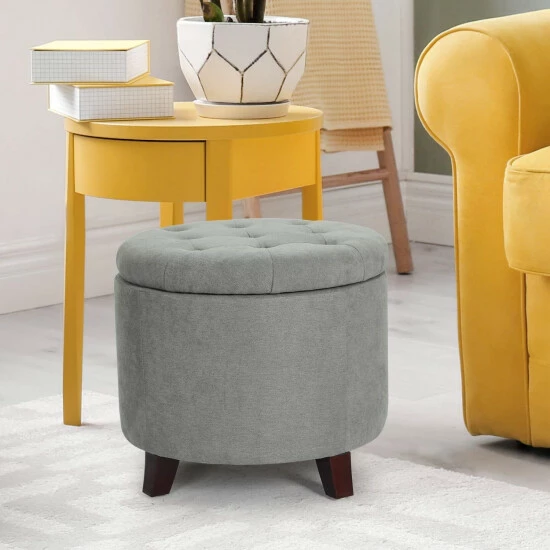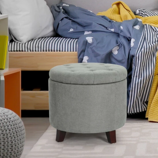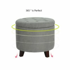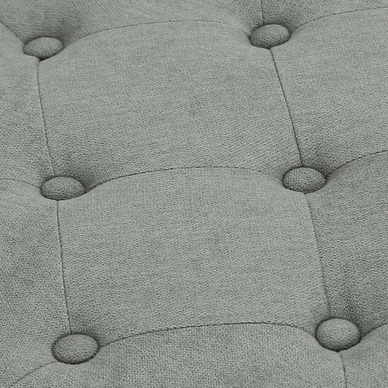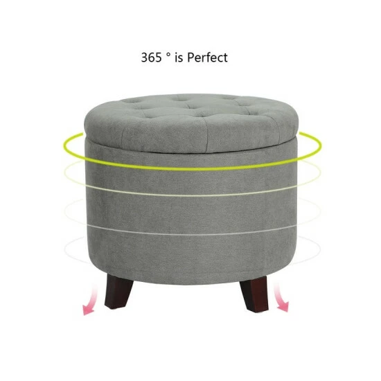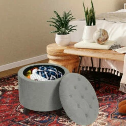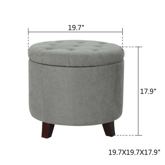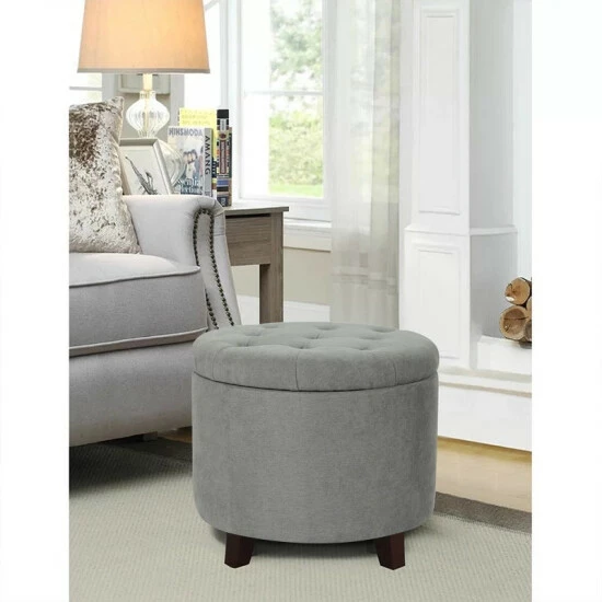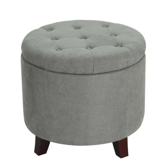 Increase your comfort and storage space with the Bocono ottoman. The solid wood frame features a cushioned, tufted top, and grey fabric upholstery. Lift the round lid to reveal inner storage space for books or blankets.
