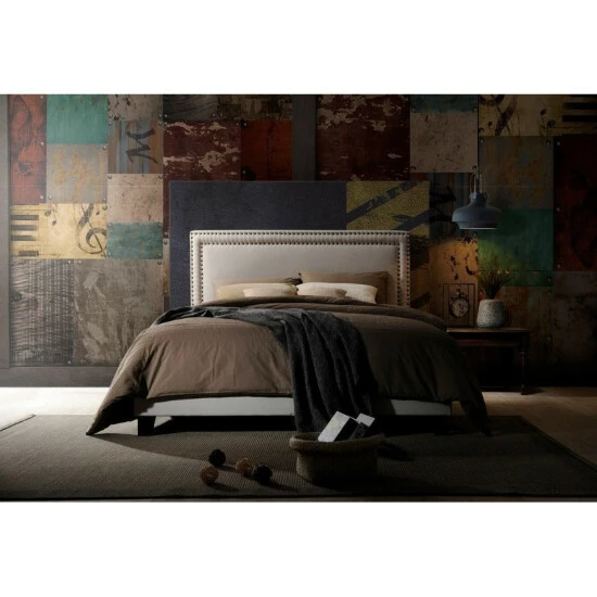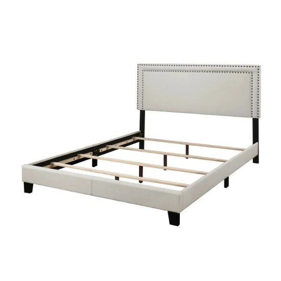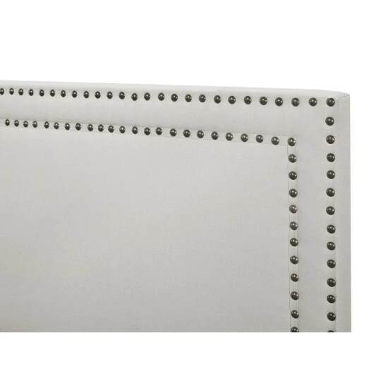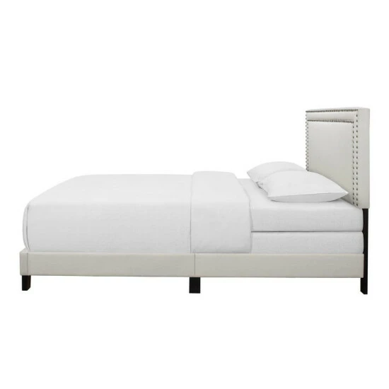 Support your mattress and box spring in unparalleled style with this beautiful bed frame. The beige polyester upholstery is neutral, making it easy to pair with any decor. The headboard features a nailhead trim for a glam flair.