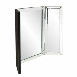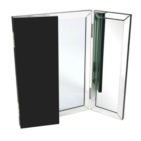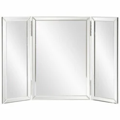 This tri-fold mirror is a perfect choice for a vanity table. The two side mirrors fold completely flat if needed so you can set the entire mirror against a wall for maximum reflective space or fold them in to get a new angle on your morning routine. Regardless of how you use it, it will add an element of timeless art deco style. Β There is a central rectangular mirror with 2 “door” mirrors. Each section is trimmed with a mirrored border. Each mirrored section of the border has a small bevel adding to its style and beauty. This piece is a table top mirror and cannot be hung. Perfect to be used on a vanity or desk.