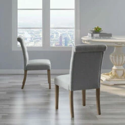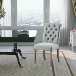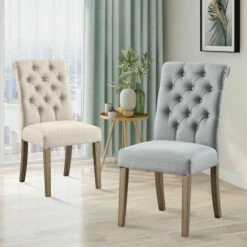 Fusing a luxe, appealing button tufting with cruelty-free fabric upholstery, this handsome twosome, including a couple of handsome, armless chairs, arrives in a grey fabric upholstery sure to not only catch your eye but also a charm for years to come. The clean, armless design and button tufting of these stunning armless dining chairs elevate any space with timeless panache.