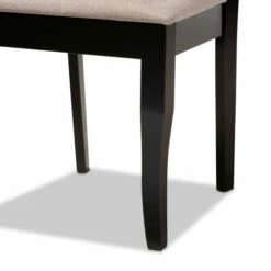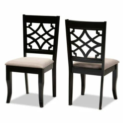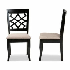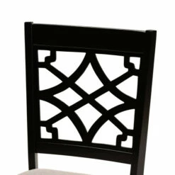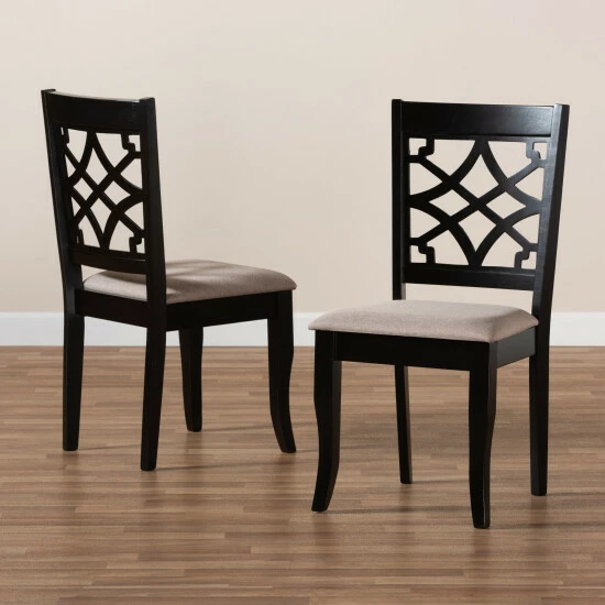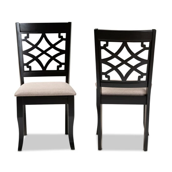 Cultivate an air of elegance in your dining room with the dining chair. The chair is constructed from solid oak wood. This piece showcases a rich espresso brown finish that complements the light fabric upholstery. Designed with both comfort and style in mind, the features a plush foam-padded seat, as well as an exquisite cut-out design on its back. Saber legs add a classic, refined touch of grace.