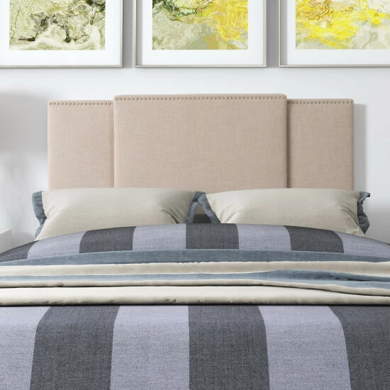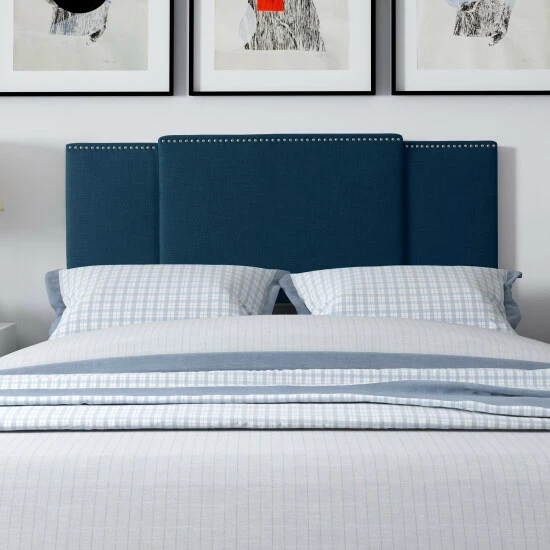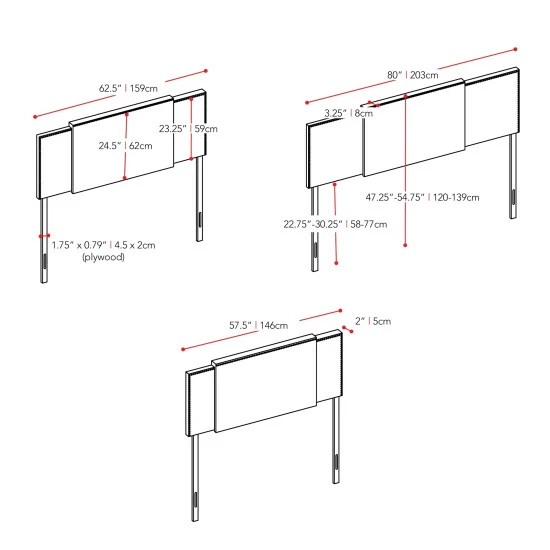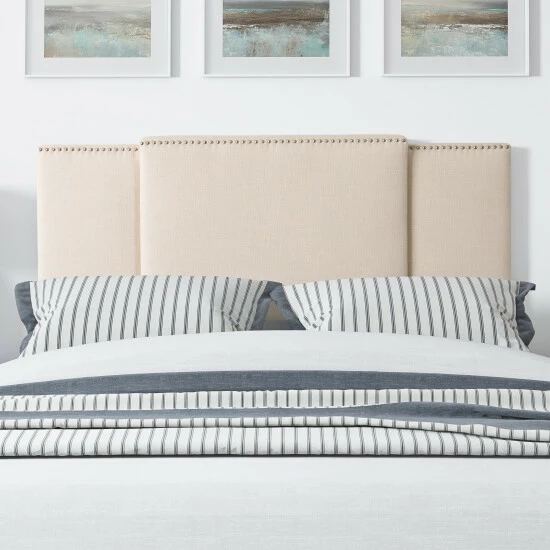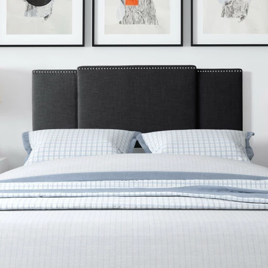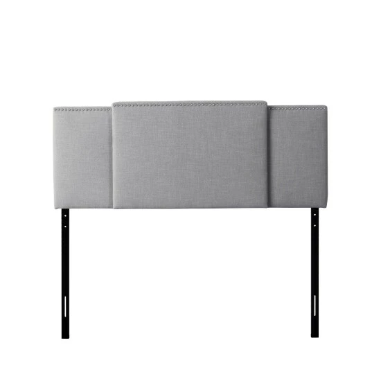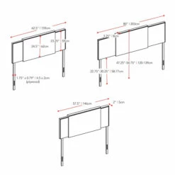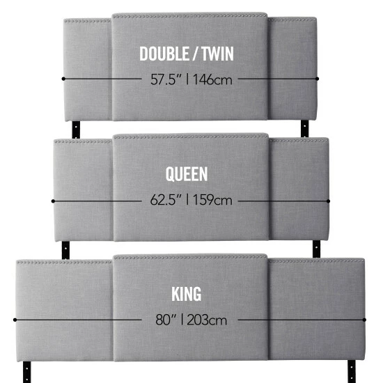 Create a designer look in your bedroom with this unique padded upholstered headboard. The versatile expanding panel feature gives you the flexibility to accommodate a double, queen or king size bed, making it simple to create a luxurious focal point in any bedroom. This beautifully designed headboard is equipped with standard holes on the legs, allowing it to attach to most standard bed frames. Height adjusts from 47.25′ – 54.75′ depending on the height of your bed. Refer to diagrams for expandable headboard dimensions for desired bed size – double, queen or king.