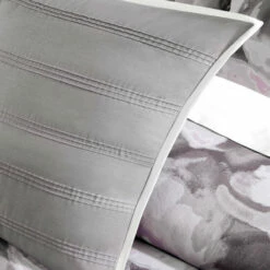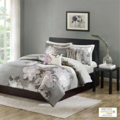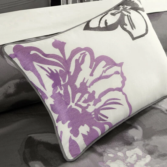 This serene duvet cover boasts a 200 thread count cotton sateen fabrication for a relaxed matte look. A solid charcoal grey covers the cotton/poly reverse. Three decorative pillows use embroidery and fabric manipulation to provide additional details making this collection feel unique to your space.