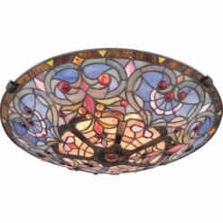 Add an artistic finishing touch to your space while providing essential lighting with this gorgeous Tiffany-style light fixture. Expertly-placed pieces of art glass in shades of blue, yellow, and grey create a beautiful design that springs to vibrant life when the light is switched on.