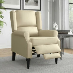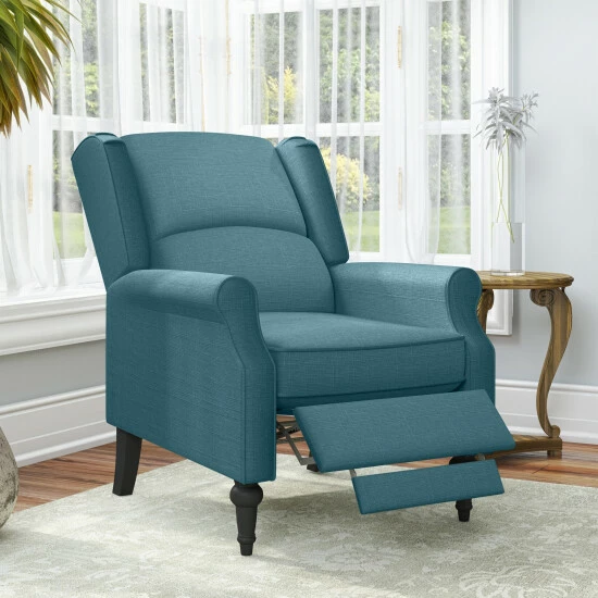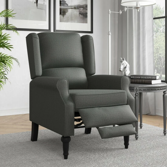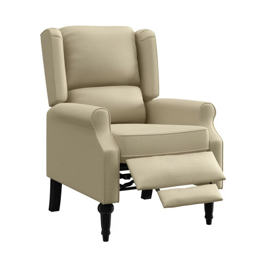 This push back recliner chair is covered in a textured linen-like and allows you to simply push back to recline, no levers or buttons required for ultimate comfort. The recliner features a wingback design, rolled arms and a square shaped bustle back that will transition from traditional styles as well as more modern looks.