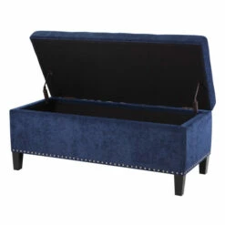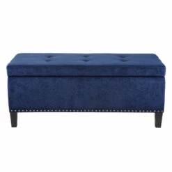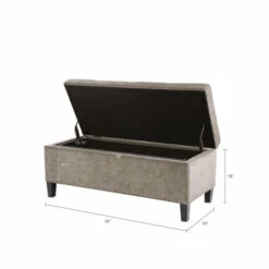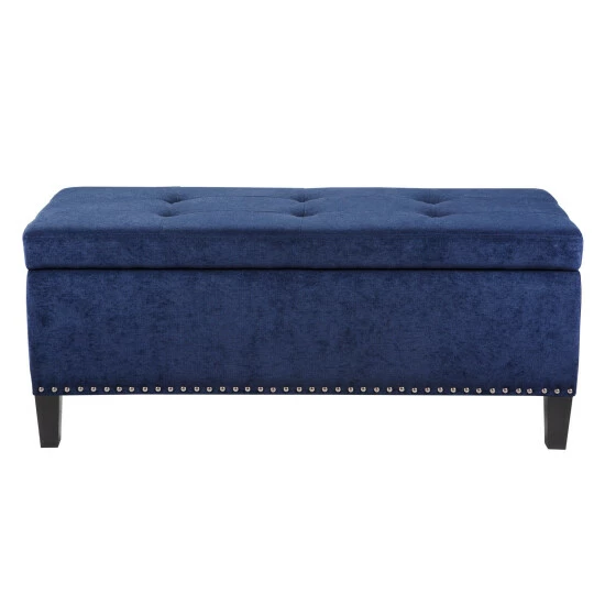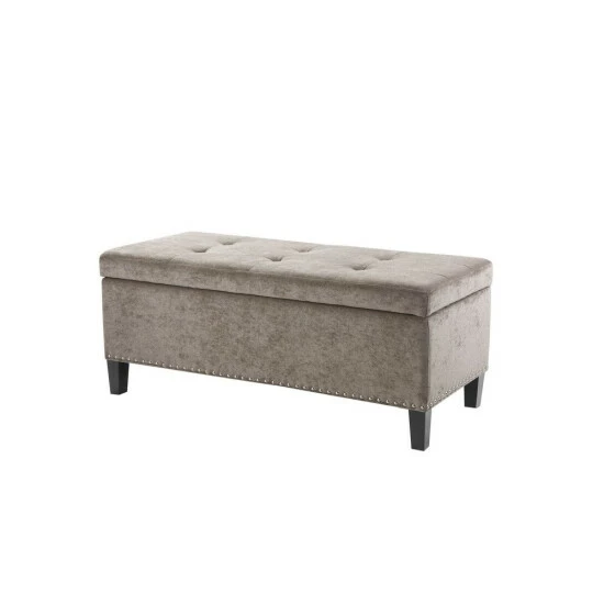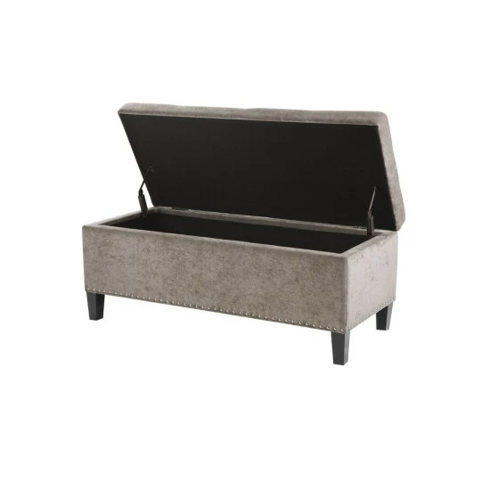 This attention-grabbing yet subtly elegant and sturdy bench is crafted of engineered and select hardwoods, complete with a padded, button-tufted, hinged lid that opens to reveal a spacious storage area. The soft, rich, blended fabric upholstery is embellished with silvertone nailhead trim and black legs.