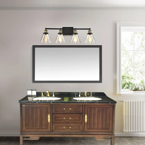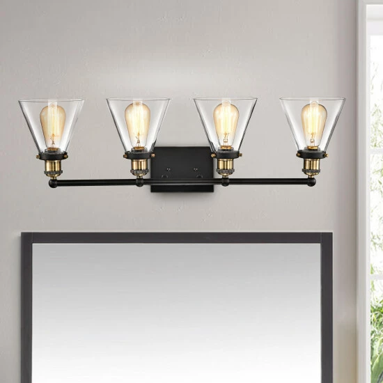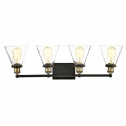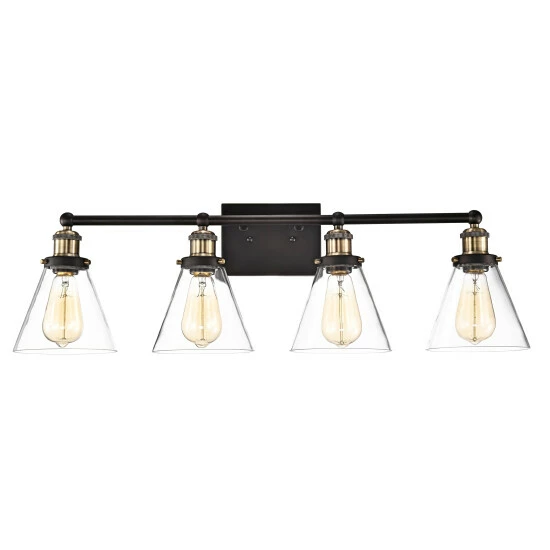This ravishing four-light bathroom vanity fixture flaunts an oil-rubbed bronze finish that will complement many rustic and industrial spaces. Boasting clean lines on a steel frame adds interest, while clear glass shades provide uninterrupted light for your own personal getting-pretty space.