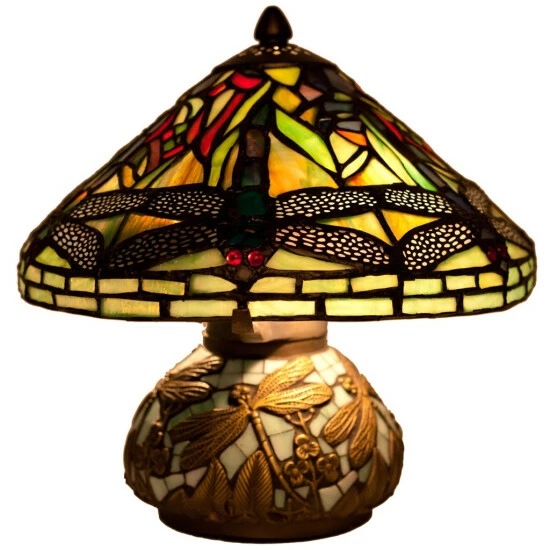 Β A True Classic. Inspired by the Hanging Head Dragonfly lamp originally designed by Louis Comfort Tiffany and Clara Driscoll, this mini version encompasses great detail and lively character. The dragonflies, buzzing above the elements of green, orange, and yellow glass cuts, leaves you feeling serene with nature. The base is detailed with dragonflies and mosaic glass pieces. TIFFANY STYLE LIGHTING: This reproduction is a must-have addition for your stained glass collection without having to give up space. FINE DETAIL: Each dragonfly wing is adorned with an intricate metal filigree. FEATURES: 288 hand cut pieces of glass and 12 cabochons. FEATURES: In-line switch and cord length of 66″. REQUIRES: Two (2) 25W, E12 bulbs (not included). OVERALL DIMENSIONS: 10.25″L x 10.25″W x 10.5″HΒ