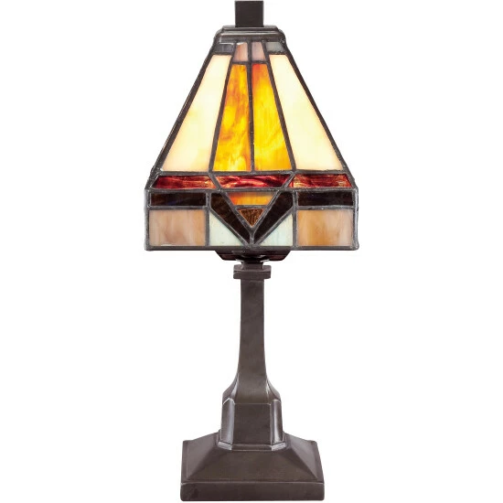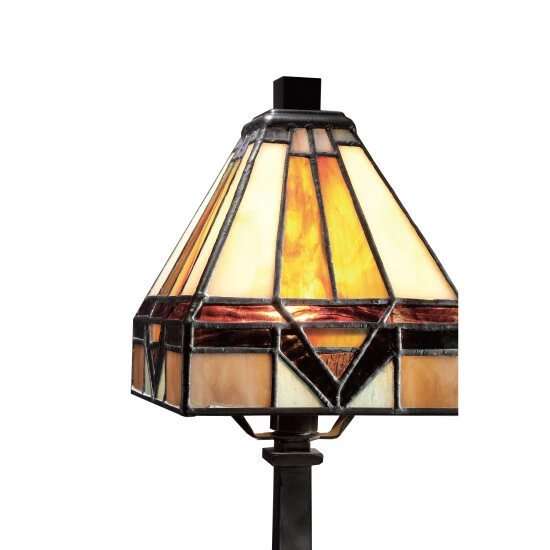 Bring traditional elegance to your space with this Copper Grove Sandpoint desk lamp. The petite lamp features a uniquely contoured pedestal base and a tapered, Tiffany-style shade with hand-cut pieces of stained glass, wrapped in copper foil and arranged in a geometric design. The lamp requires one 25-watt bulb that combines with the neutral tones of the shade to create a warm and welcoming glow.