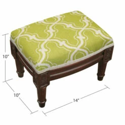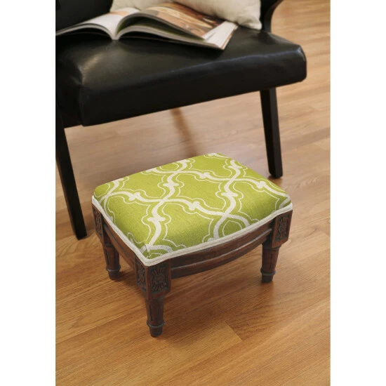 This piece is the ideal pop of color in a drab space, as it features solid wood construction with intricate carvings, heavy linen upholstery, and double welts, for a charming piece that sure to become a favorite for years on end. Soak up the glamour emanating from this compact, charmingly styled footstool, complete with off-white trellis patterns.