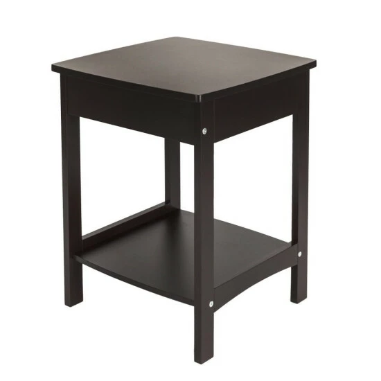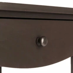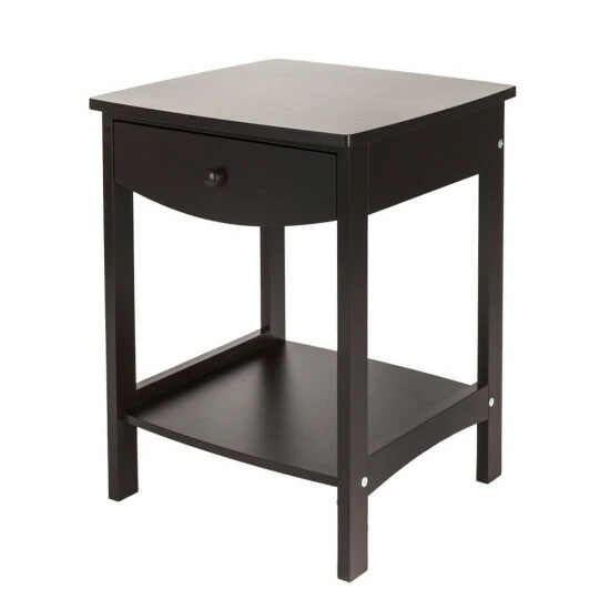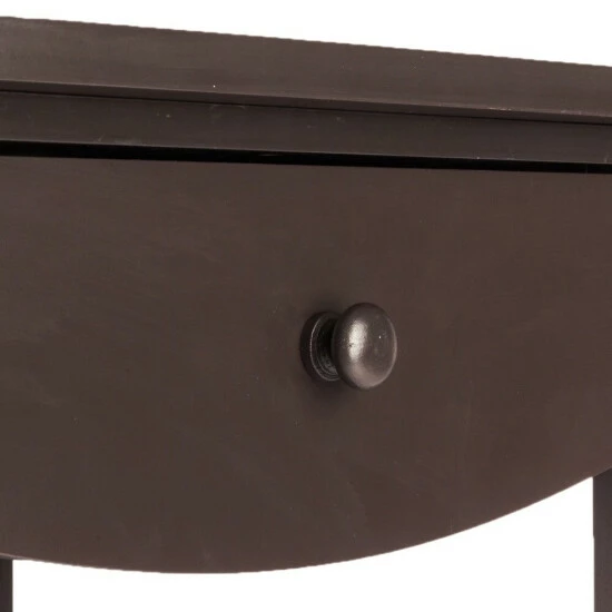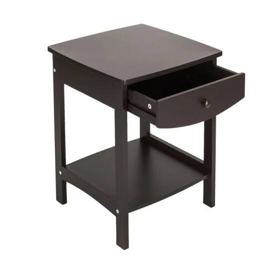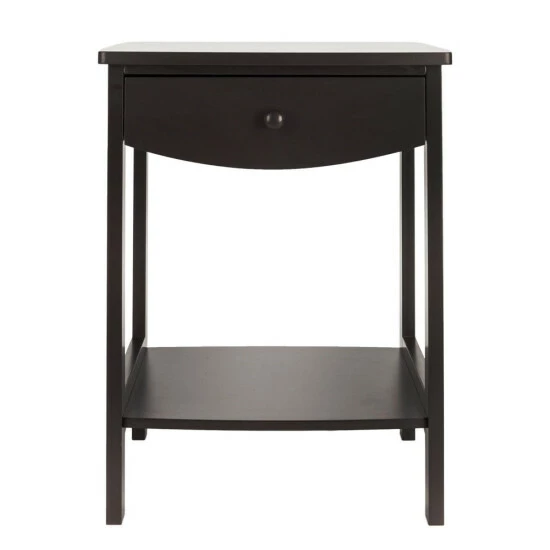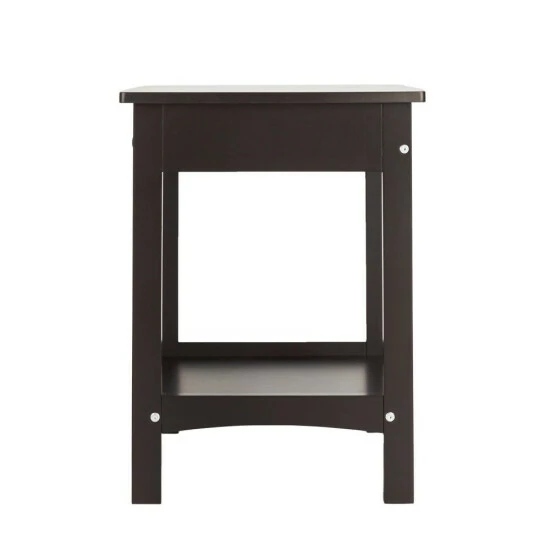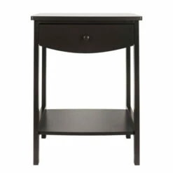 Showing off a fabulous two-tiered design, along with a handy storage drawer for convenient bedside access, this end table (or nightstand, if that’s how you wish to use it) has a dark coffee brown finish, a bronze metal pull, four straight legs, and a bottom display shelf for showing your favorite things.