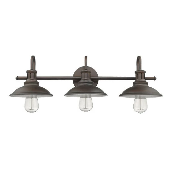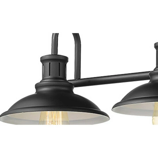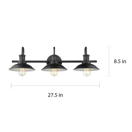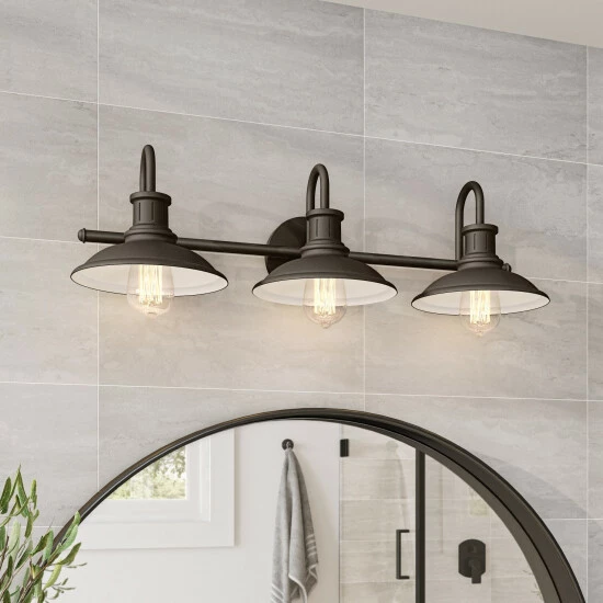 With its chic look and classic black finish, this three-light down fixture is a great choice for a variety of aesthetics. With a mix of modern and restoration design and finished in our traditional black finish, this over-the-mirror, three-light vanity lighting fixture works perfectly for your remodeled bathroom.