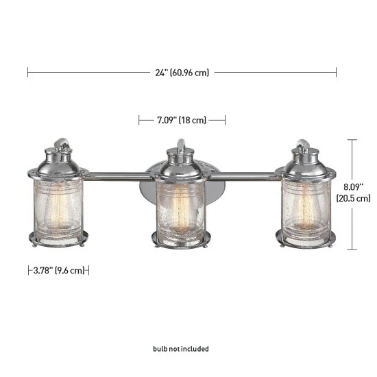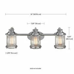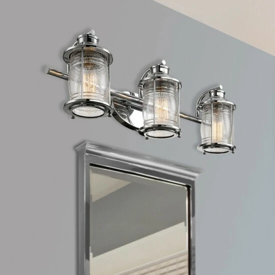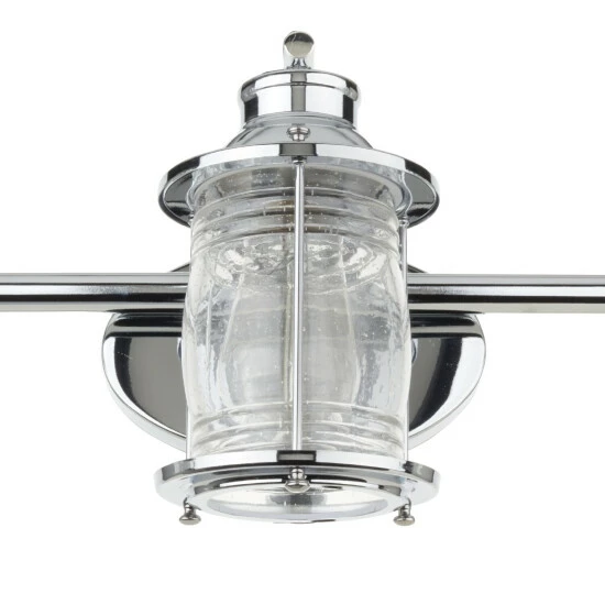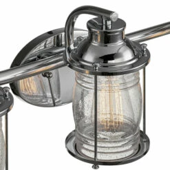 With simple lines, coastal accents, and a polished chrome finish, this three-light vanity lighting fixture can be placed anywhere you need extra light. Textured glass shades diffuse the light just perfectly, for a wonderful ambiance you’re certain to treasure.