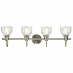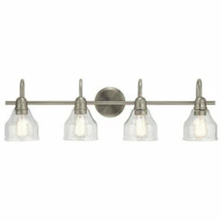 This 4-light bath/vanity fixture features a brushed nickel finish that will complement many transitional decors throughout your home. The clean lines of the steel frame add interest while the clear seeded glass shades allow the light to bounce giving a unique look to many spaces. In a brushed nickel finish with adjustable cording, clear seeded glass, and working paddle switches, this pendant stands out beautifully on its own or in a cluster.