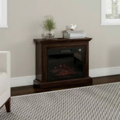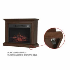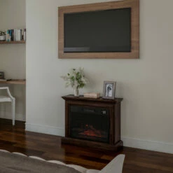 Make a house a home in one fell swoop, with a little help from this vent-free electric fireplace TV stand. This entertainment console features a mantel that fits flat screen televisions up to 32 inches, an open media shelf for cable boxes, DVD and Blu-ray players, and an electric fireplace insert that can heat up to 400 square feet. Its slim profile is ideal for tight spaces, small rooms, apartments or an office. With a push of a button, you can turn the heat function on or off and enjoy the warm glow of the LED flame over the decorative logs, for the ultimate in cozy home comfort.