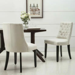 This set of two Coldspring dining chairs from Copper Grove is a beautiful example of mid-century modern and modern style. Each of the two chairs features padded, button-tufted fabric upholstery on a light wood frame. Buy additional Copper Grove Coldspring chairs to create a cohesive dining set at your dinner table.