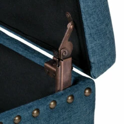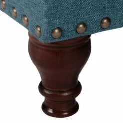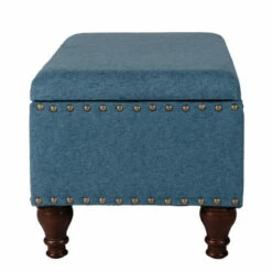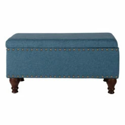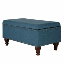 Add style and storage to any room in the home with this classic blue bench. Featuring timeless nailhead trim and spiral wood legs in a light cherry finish, this storage bench is a multi-tasker. Use it to provide extra seating or extend hospitality as a coffee table ottoman. Put it to work holding pillows or throws as an end of bed bench. Strategically position it in an entryway or mudroom to contain outdoor accessories or shoes. Undeniably a premium addition to your home at a reasonable price, make this your next accent furniture investment. Easy to assemble and maintain.Β