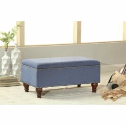 Add style and storage to any room in the home with this classic blue bench. Featuring timeless nailhead trim and spiral wood legs in a light cherry finish, this storage bench is a multi-tasker. Use it to provide extra seating or extend hospitality as a coffee table ottoman. Put it to work holding pillows or throws as an end of bed bench. Strategically position it in an entryway or mudroom to contain outdoor accessories or shoes. Undeniably a premium addition to your home at a reasonable price, make this your next accent furniture investment. Easy to assemble and maintain.Β